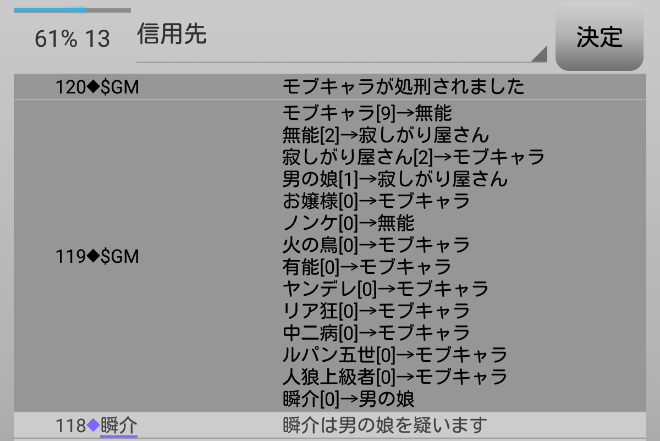 そして今日はモブキャラ吊りになるのか。モブキャラ狩人とかやめてくれよお。ところで、狩人って1日目に●を出されたらCOするのかな?しないか。最後の発言になります!人狼達よ!俺を噛め!俺は『男の娘を疑っています』。