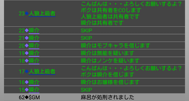 瞬介「噛みは発生していない。思惑通り共有者(僕)噛みからの狩人GJが起きたのかね(違うかも知れないけど)」