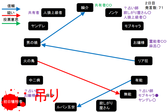 瞬介「火の鳥がお嬢様に投票意思を示しているね。この火の鳥の投票宣言はお嬢様が真占い師として確定する前のことなので気にしなくても良いだろう。あとは、無能がモブキャラ●を出しているけど、モブキャラは村陣営ではないかな(人外による●出しなので)?」