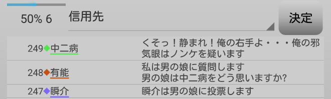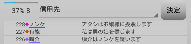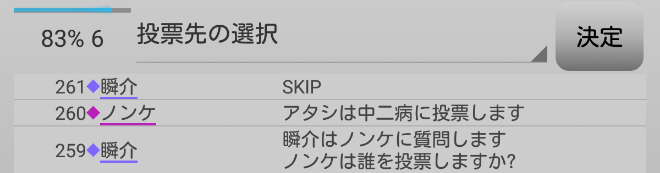瞬介「議論はこれで終わり。投票の時間になります。俺がグレーの男の娘投票とか単独行動を繰り返して信頼値を落としたのもだめだったな。配役が見えているからと1人で変なことをするのは逆効果だと勉強になった。『ノンケへ投票をします』」