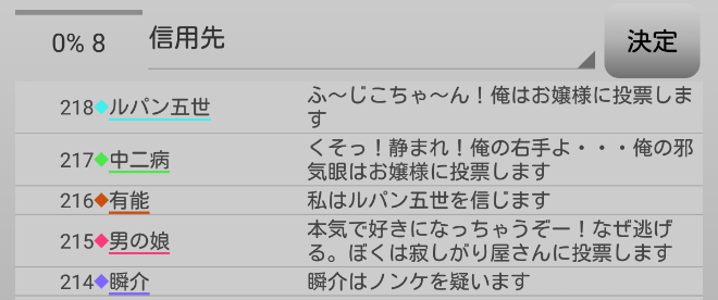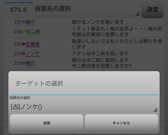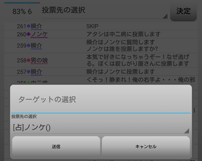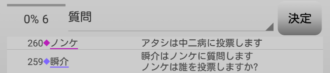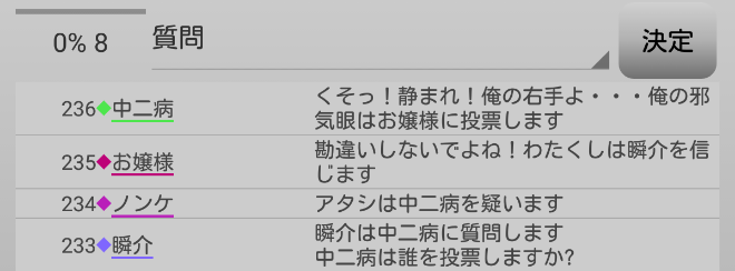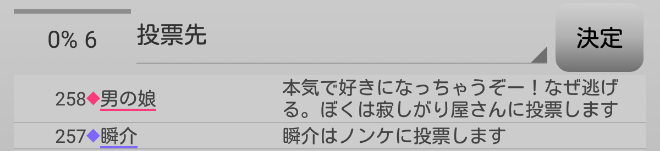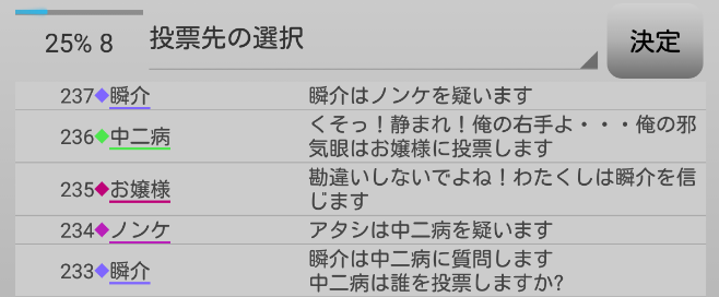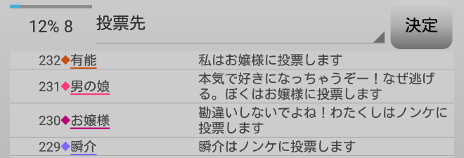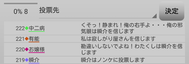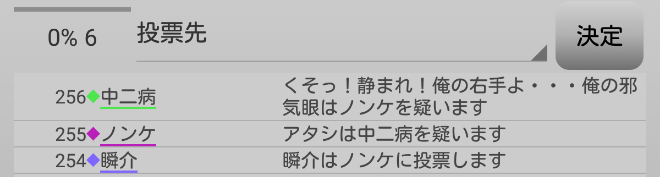瞬介「議論はこれで終わり。投票の時間になります。寂しがり屋さんの投票が中二病へ動いたら引き分けも無理だ。投票先を質問しておけば良かったなあ。有能の投票を動かしたい一心でノンケへ投票宣言を連打してしまった。人狼2人が妖狐へ投票するのを祈って『ノンケに投票』をします」
