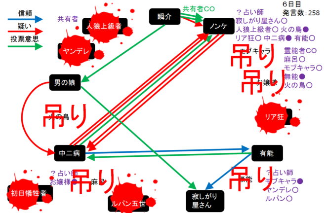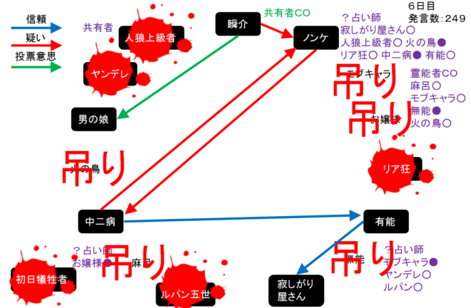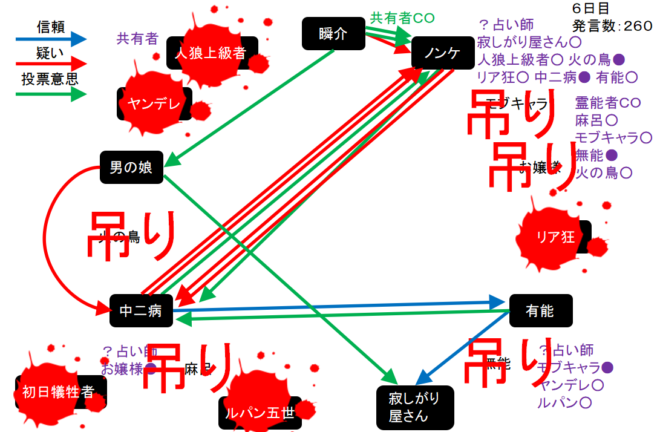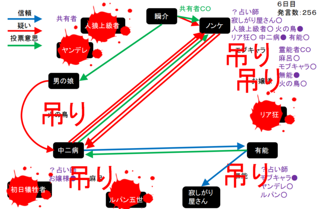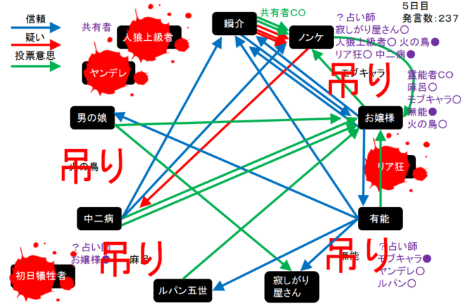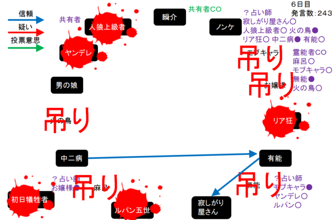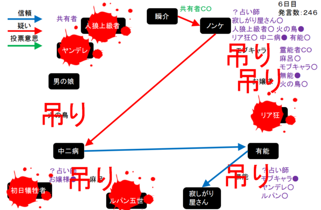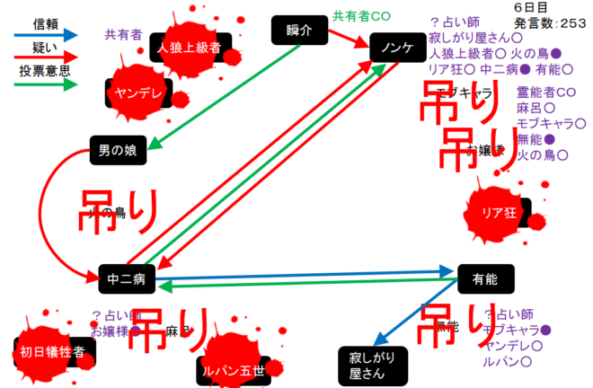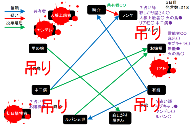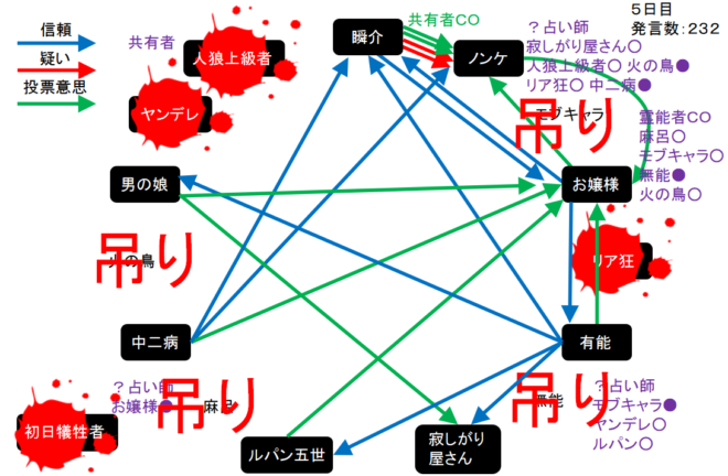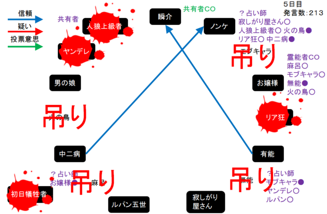下手をすればお嬢様が吊られてしまうのかな。まだ妖狐もいるのに厄介だ。ノンケを吊ってしまおう。『ノンケを疑っています!』」