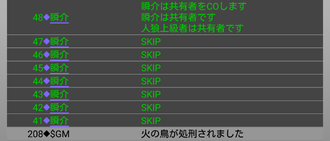 瞬介「ノンケはマジで妖狐寂しがり屋さんを放置するのかよ。これは寂しがり屋さんが中二病へ投票して終わるな。ノンケが嘘をついて妖狐寂しがり屋さんへ投票することを願って、最後の議論は『スキップ』します」