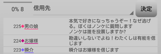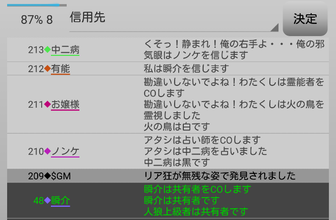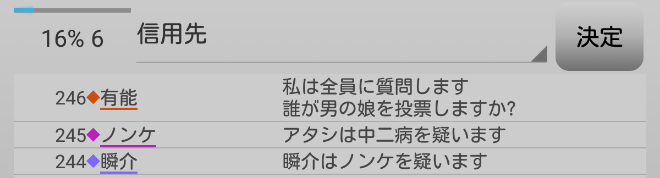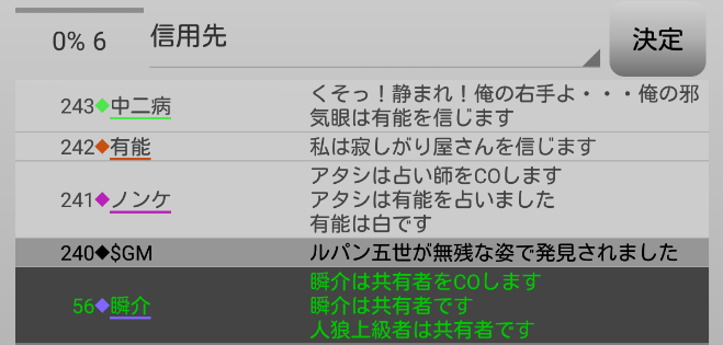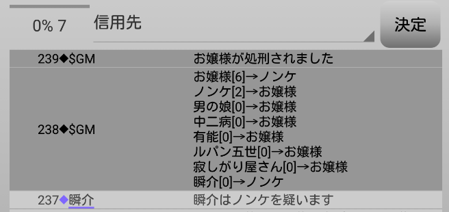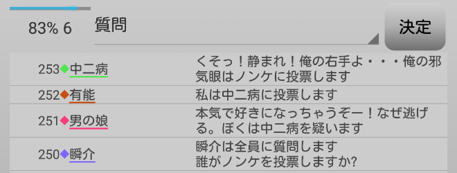 瞬介「中二病がノンケを疑っているのか。ノンケを吊って7日目をやろうぜ。もしかしたら有能が狩人かもしれないしね。『誰かノンケに投票をする人はいませんか?』」