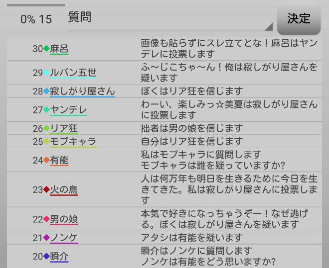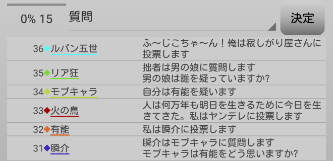 瞬介「お嬢様も有能疑い。うーん、作戦は順調なのかな?質問はあと2回しかできないので怪しいプレイヤーや頼りになるプレイヤーへ質問をしておこう」