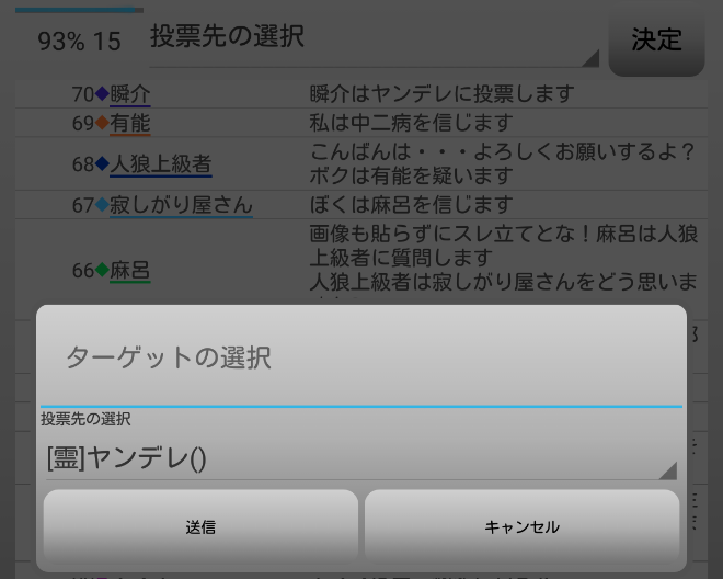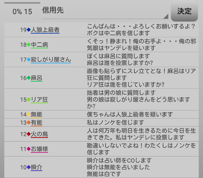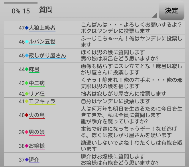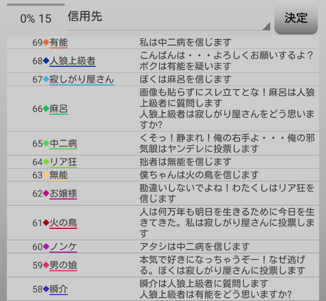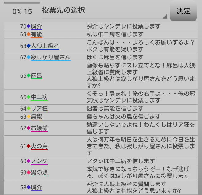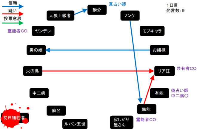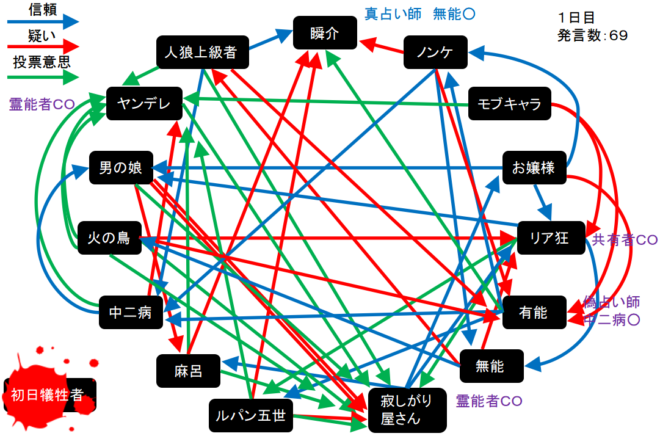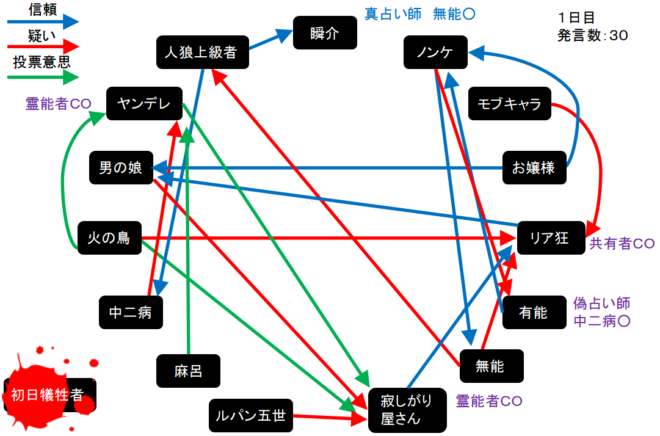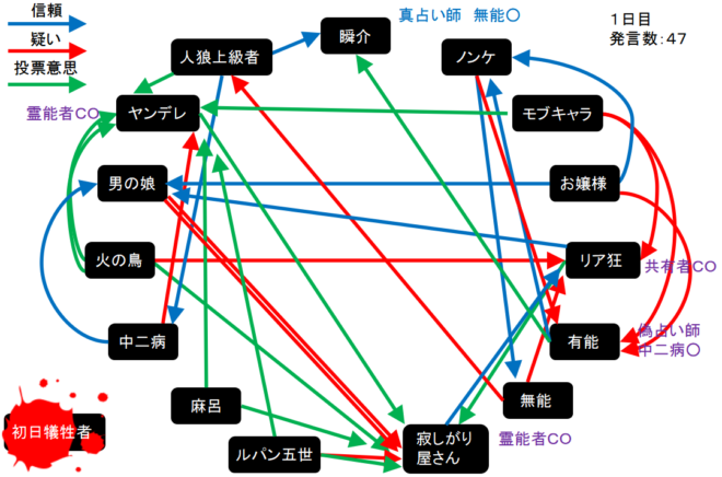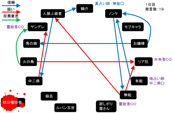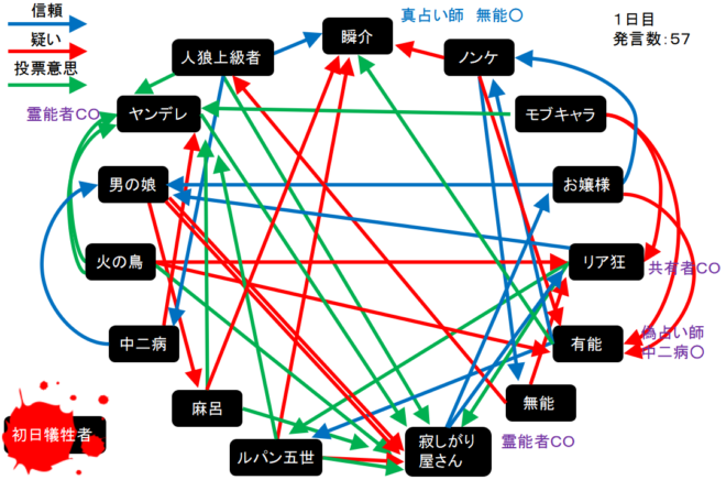 ノンケは投票意思無し。モブキャラはヤンデレ、お嬢様は意思無し、リア狂はルパン、有能は俺、無能は意思無し、寂しがり屋さんは対抗のヤンデレだろう。ルパンはヤンデレ、麻呂は寂しがり屋さん、中二病はヤンデレ、火の鳥は寂しがり屋さん、男の娘は寂しがり屋さん、ヤンデレは対抗の寂しがり屋さん、人狼上級者は寂しがり屋さんかな。