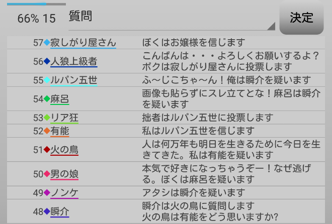 瞬介「火の鳥は有能を疑った。まあ火の鳥はやたらと疑いまくるプレイヤーなので平常どおりなのかな。それよりも、なぜか偽占い師有能がルパンへ信頼発言を送りルパンは俺を疑い始めた。これは怪しむべき発言だと思うので次に俺が占うとしたらルパンか?」