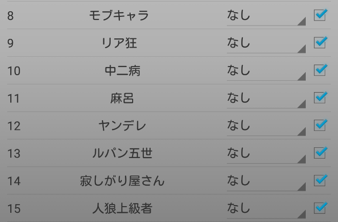 現在のグレーは『ノンケ、モブキャラ、お嬢様、ルパン、麻呂、火の鳥、男の娘、人狼上級者』の8名。この中に人狼が3匹と妖狐がいるのかなあ。