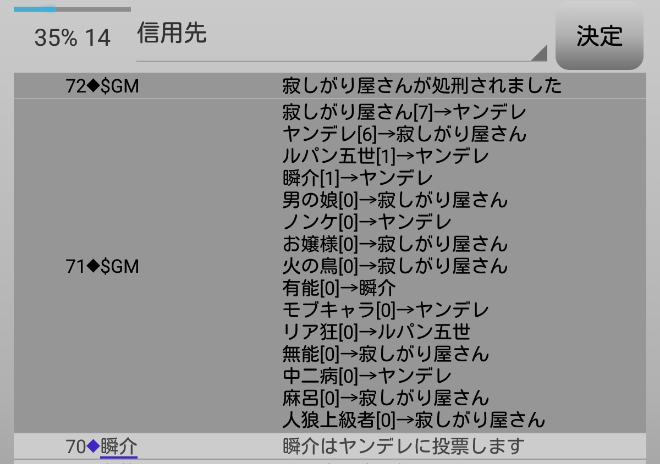 瞬介「人狼上級者も有能を疑っているようだ。次が最後の発言になる。霊ロラの再投票を目指して各プレイヤーの投票者を見てみようか(2人にした場合は直近の発言)。投票意思を示していないプレイヤーが何人へ質問をしておくべきだった(泣)」