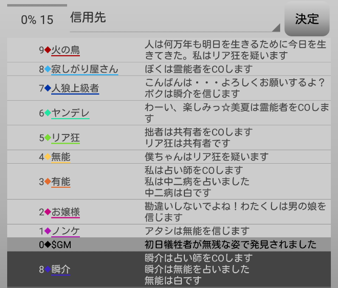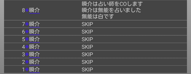 瞬介「ノンケは有能に疑い発言を飛ばした。役職者からの疑い発言を煩わしく感じた有能に偽●を出させて破綻させようというわけだ。しかし逆に信頼を得ようと有能は偽○を出すかもね」