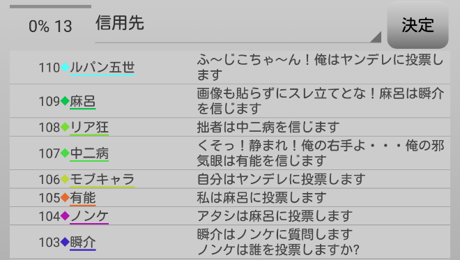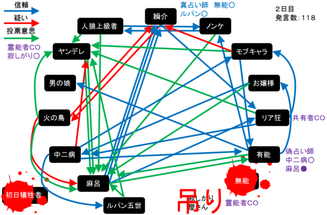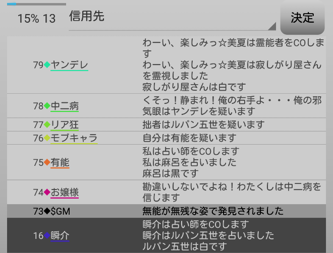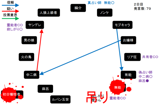 瞬介「1日目の議論で怪しいと感じたプレイヤーは、偽占い師の有能が信頼発言を飛ばした『ノンケ』、『ルパン』、『中二病(○持ち)』だ。共有者リア狂がルパンへ投票しているのをどう判断しようか」