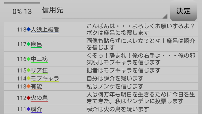 ヤンデレは真霊能者だろう。本来ならば吊りたくはない。だけどAI達はヤンデレの霊能結果なんて信じやしないだろう?吊るしかないんだよ!俺は「ヤンデレ投票をする人狼上級者を信じます」・・・いや、真占い師確定していない俺が変に信頼をすると麻呂吊りに意見を変えるかもしれない。人狼っぽい『火の鳥を疑います!』」。