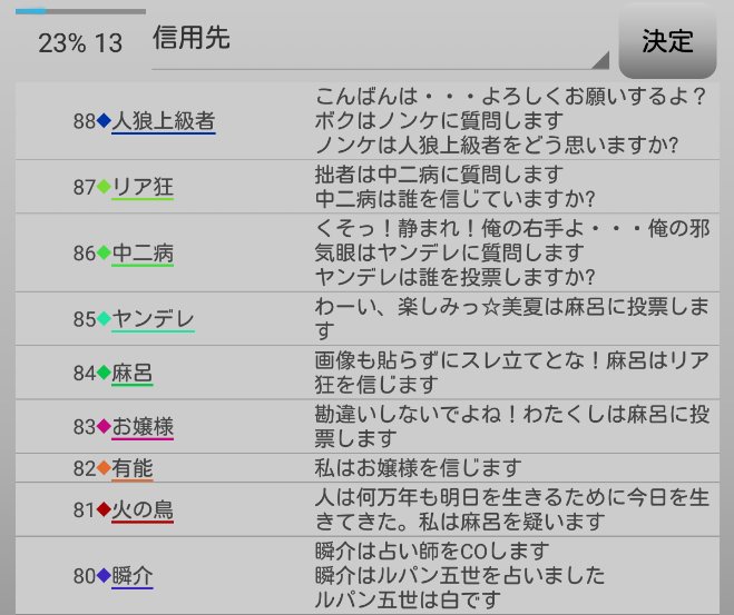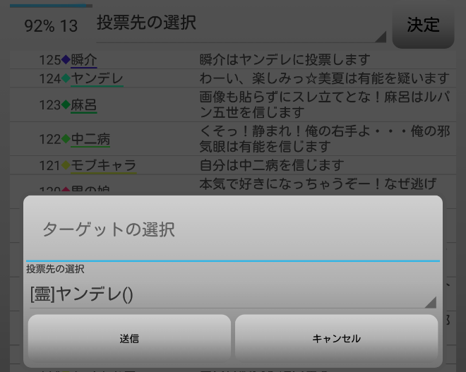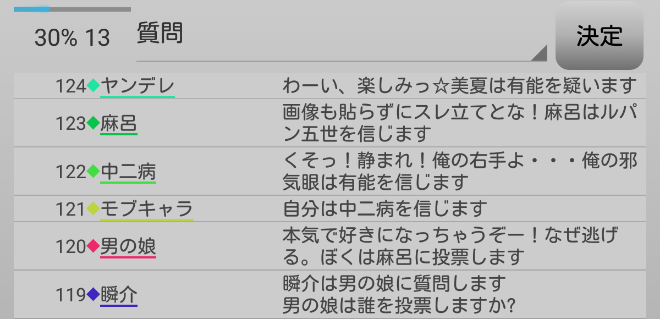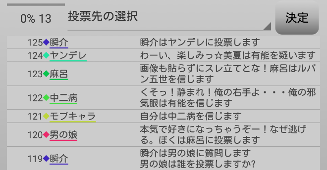 困った。火の鳥どころかノンケもお嬢様も人狼上級者も怪しい。質問はあと1回できるのか。男の娘が投票意思を示していないようだな。質問をしてみよう。『男の娘は誰に投票をしますか?』。