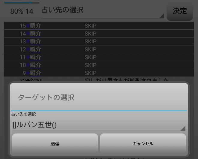 ルパンの占い結果は・・・○だった(下の図)!また人狼を引き当てられなかったよ!