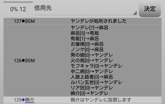 瞬介「ノンケは麻呂投票!?あの冷静沈着なノンケがなぜ霊ロラを無視する!?ルパンは役職情報重視値がMAXだから麻呂投票も仕方ないと諦めていたけど。そのルパンがヤンデレ投票に動いたか。あとは俺がヤンデレに投票をすれば霊ロラ完遂するかな」
