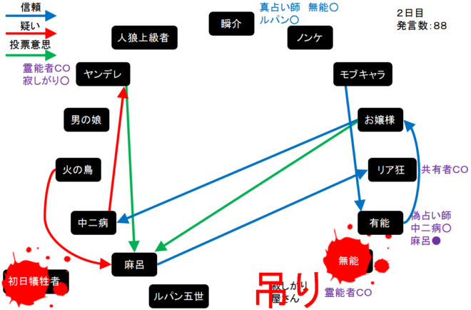 霊ロラを無視している火の鳥があからさまに俺へ疑い発言を飛ばしやがった。くっそー!好き勝手にやりがって!同じく霊ロラを無視しているお嬢様へ偽占い師の有能が信頼発言をしている。『有能、火の鳥、お嬢様』は人狼陣営であろう。有能は狂信者かもなあ。