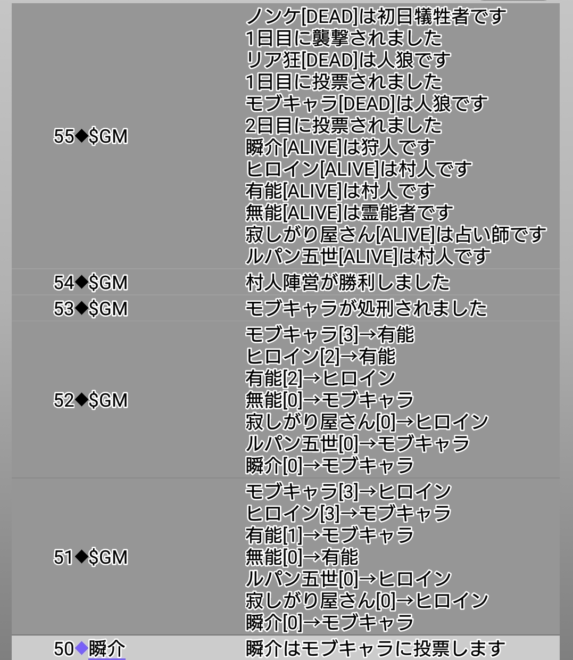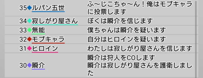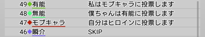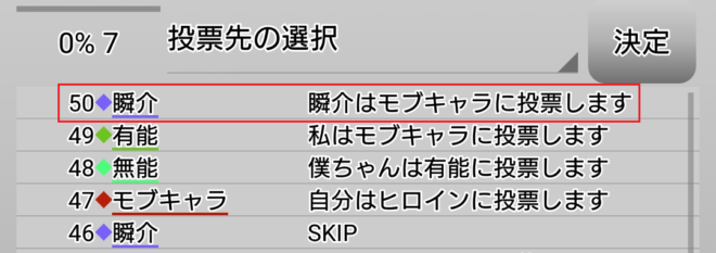 瞬介「おいこら!投票先が割れすぎだ!・・・って、モブキャラがヒロインに投票宣言をしたあとに有能はモブキャラへ投票宣言か。確かにモブキャラは潜伏をし過ぎているから怪しい。それを思えばヒロインが行った役職者への信用発言は彼女らしい動きだな。モブキャラが潜伏しつつ行った投票宣言を人狼が最後の最後に見せた尻尾だと判断して俺は投票先を変える。『モブキャラに投票します!』」