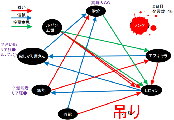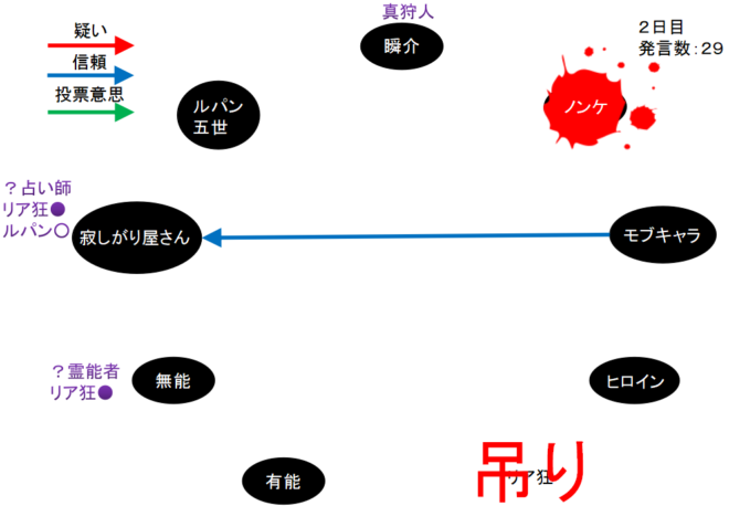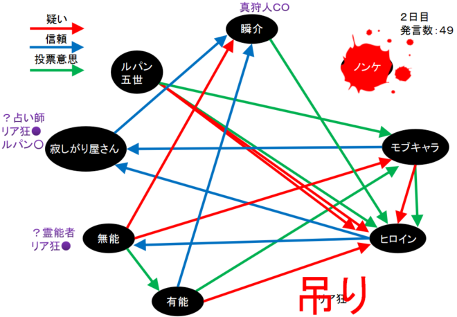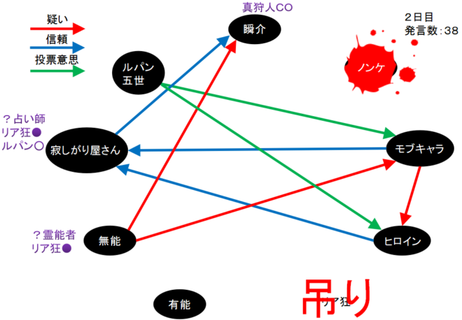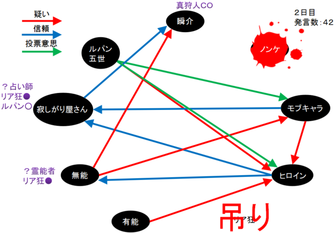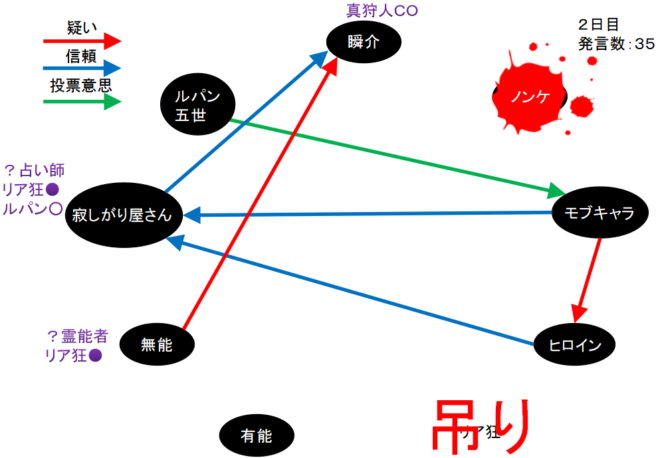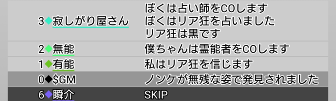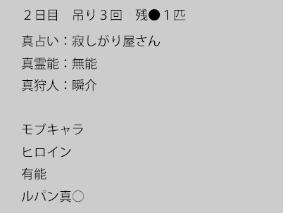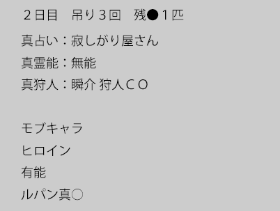 瞬介「この2日目に俺が吊られないことだ(笑)。しかし1日目は人狼の噛みを避けることばかり考えていて無茶苦茶な行動ばかりをしていた。2日目を吊られず乗り越える自信はないぞ!」