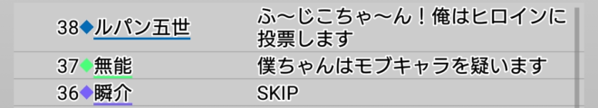 瞬介「まんまと有能に誘動されてしまった気がしないでもないけど、ルパンの変節を信じてヒロイン投票だ。もうやることはないので2日目は『スキップ』をするぜ」