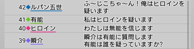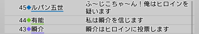 瞬介「おや?有能がヒロインを疑いだしたと思ったらルパンもヒロインへ疑い発言を飛ばした。この何回かの発言でAIを疑わせる何かがあったのだ。人狼は役職者への信頼を繰り返す癖があるのかな?それとも、あまりにも他人を疑わず推理をしないところがおかしいとか?」