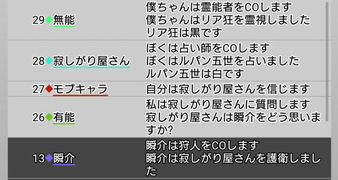 瞬介「即、狩人COをしよう。『僕が狩人です!寂しがり屋さんを守りました!!』」