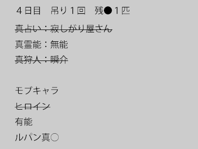 次回は反省会です!1日目、狩人の動きについて、2日目、人狼を断定できた根拠を反省したり考えたりします!