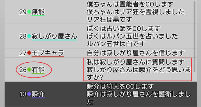人狼はすでに、狩人吊りの戦略を実行しようとしているんじゃないのか!?見てみろ!!さっそく有能が真占い師に俺の話題を振っている!