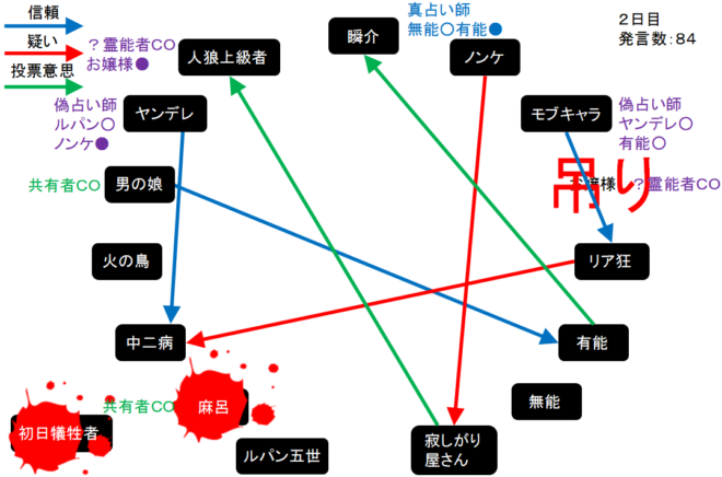 瞬介「噛みは共有者麻呂。偽占い師(人狼?)のヤンデレがノンケ●を出した。同じく偽占い師(狂信者?)のモブキャラは人狼の有能に○か。人狼上級者(たぶん人狼霊能者)の霊能結果お嬢様●が地味に後で影響しそうだな」