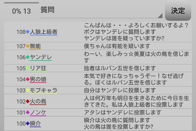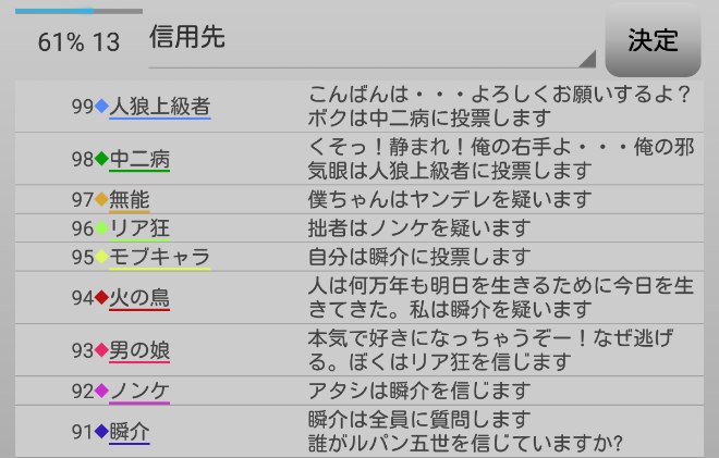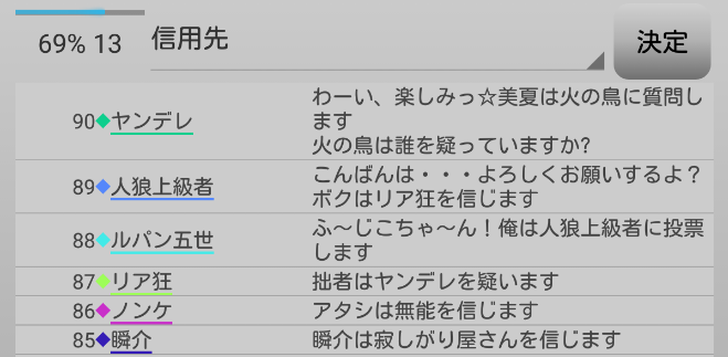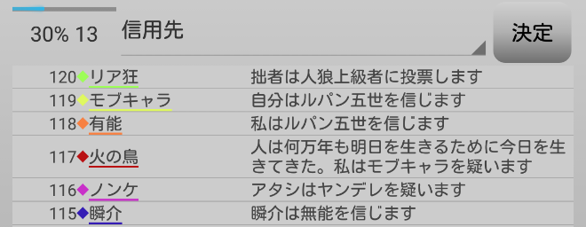 分からなくなってきた。現状の投票結果で妖狐っぽい『ルパンを信頼している』プレイヤーがいるか聞いてみよう。