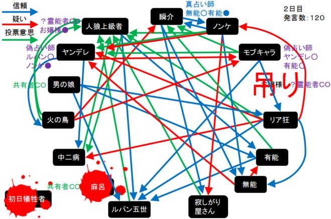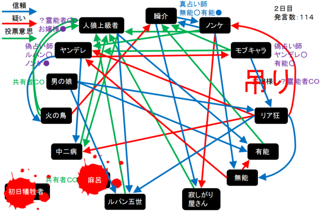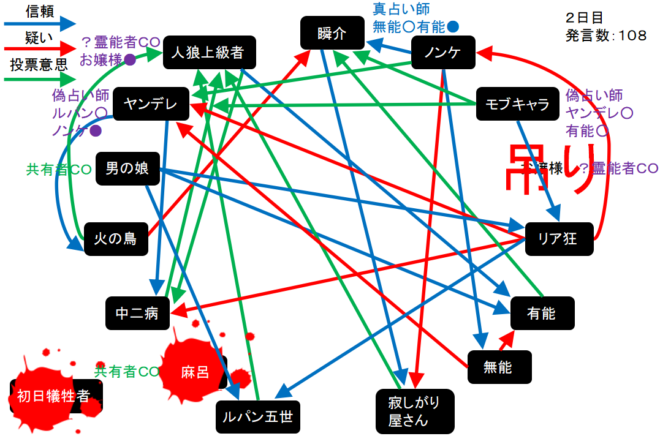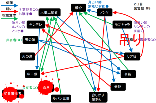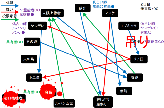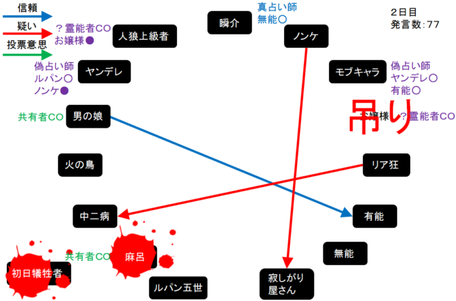 瞬介「有能の占い結果は●(上の図)!人狼の配役は『ヤンデレ、人狼上級者、有能』だったのか!」