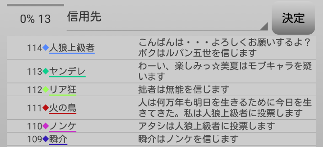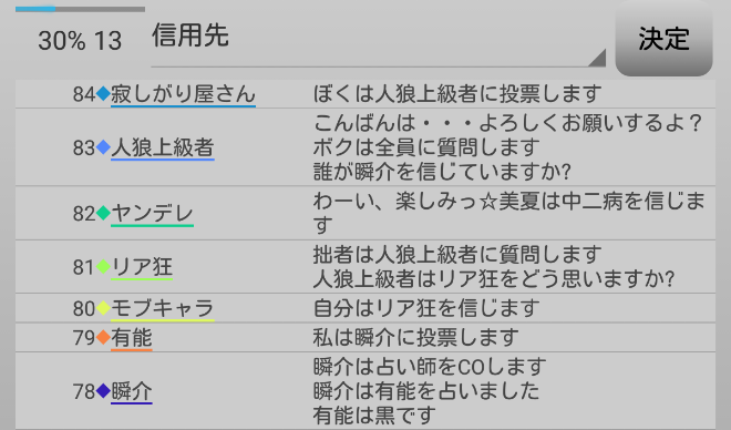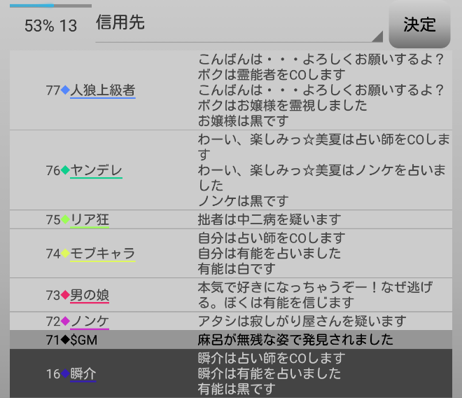 俺は占い先をミスしたら敗北すると脅えている。赤で囲んだのは霊ロラを無視したプレイヤーです。