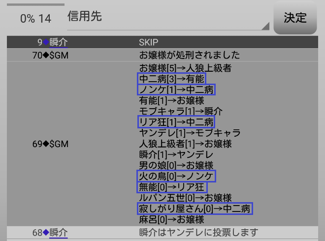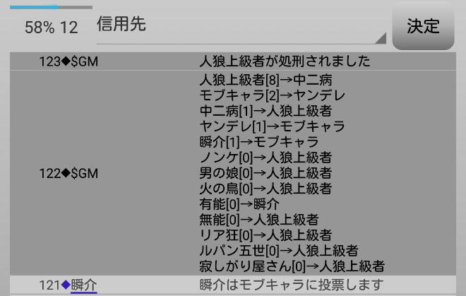 瞬介「背徳者はいないかもしれない。しかし?いれば妖狐以外の者に投票をするだろう。そして妖狐と同じものに投票をしているのかもしれない。1日目の投票では『ノンケ、リア狂、寂しがり屋さん』が中二病へ投票をしていおり、中二病、無能(俺の○)、火の鳥、は気まぐれのように単独で投票をしている」