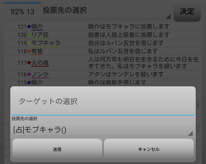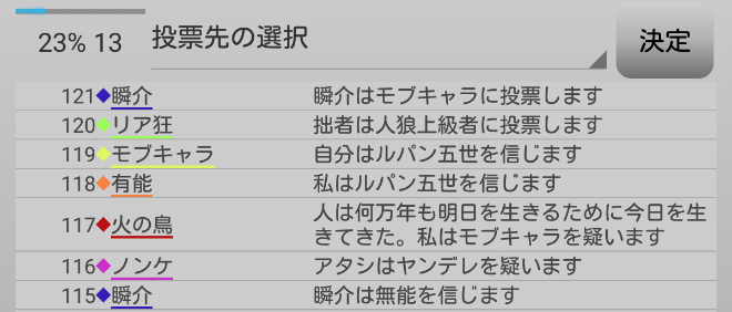 ここで俺がルパンに信頼発言を飛ばせばルパン噛みが実行されるかもしれない。いやしかし、人狼が自らの○を噛むかね?ルパンの真贋を見極めるのも重要だけど優先したいのは明日の3日目に有能を吊ることだ。有能を吊り損ねると俺が人外の票合わせで吊られてしまう危険がある。AIに違和感を与える行動はやめておこう。『対抗占い師のモブキャラに投票します!』」