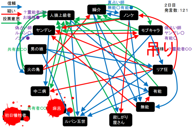 瞬介「人狼の有能と人狼上級者が俺を警戒して騒いでいるな。残りの吊り回数は6回?グレーは『リア狂、寂しがり屋さん、中二病、火の鳥』で今日、2日目は霊能者の人狼上級者吊りでしょう?吊り回数5回の3日目から●吊りが開始。吊り4回の4日目の占いでグレーはいなくなり吊り3回の5日目から対抗○占いをすることができると」