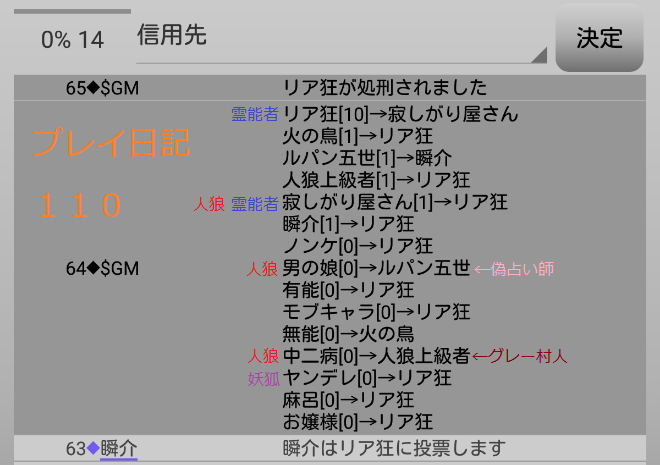 失礼。『プレイ日記110占い師は疲労困憊』の投票結果と配役を貼ります。