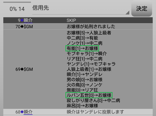 瞬介「霊ロラ参加者で怪しいのは有能とルパンの2人だけ。ルパンはヤンデレ占い師の○だよな。妖狐は霊ロラ投票者にいるとなれば?今日は有能を占ってみようか。有能が村人ならばルパンの方が妖狐だと推測できるしね」