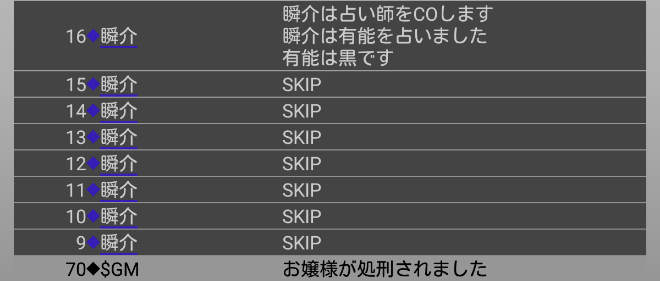 瞬介「霊ロラに参加しないリア狂を占えば人狼の配役が分かるかと思ったけど甘かった。こんなにも霊ロラを無視するプレイヤーがいるなんて誰を占えばいいんだろう」