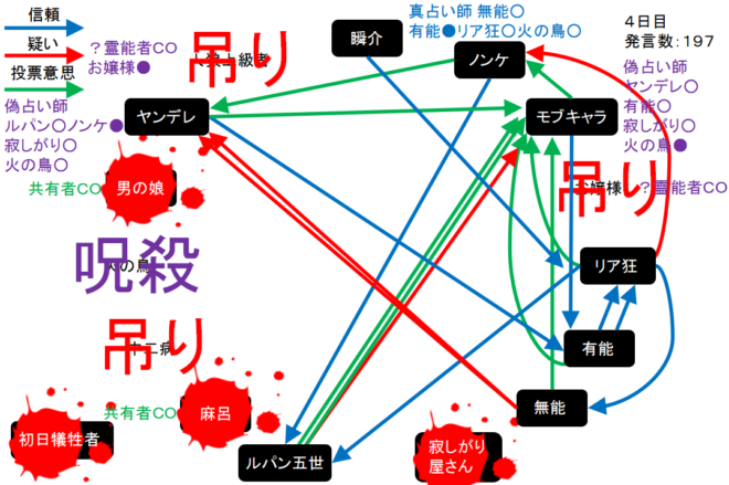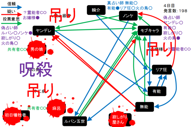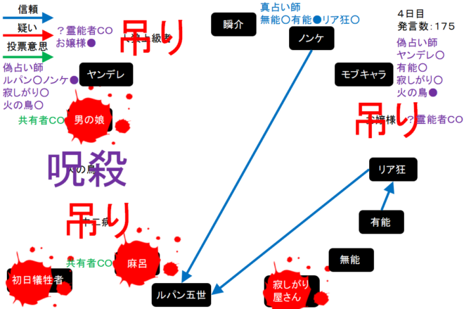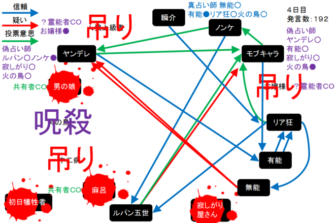 瞬介「人狼はヤンデレと有能なので、火の鳥の占い結果は当然○だ(上の図)。人狼の噛みは先は○を2つ持っている寂しがり屋さんになるのかな?」