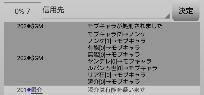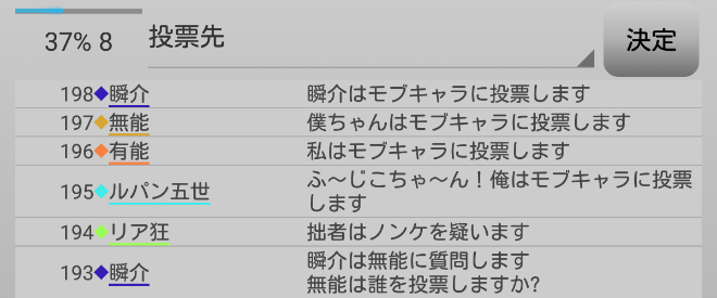 瞬介「無能も有能もモブキャラ投票を決意した。俺もモブキャラに投票をしなければ怪しまれるだろう。俺が怪しまれれば俺の○であるノンケが疑われる。現にリア狂がノンケを疑い始めているじゃないか!破綻した占い師である『モブキャラに投票します!』」