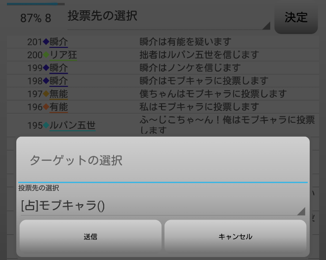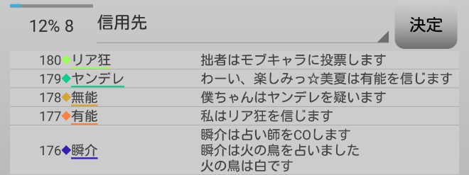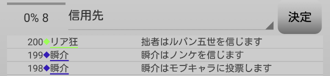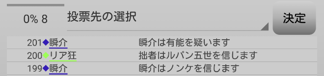 瞬介「ヤンデレが狂信者モブキャラへ投票の意思を示した。狂信者で吊り回数を消費させる戦略か。そしてモブキャラがノンケに投票宣言をしてヤンデレへの票を自身に向けようとしている。モブキャラのやろう!誘い受けみたいなやり方でノンケを誘惑しやがって!」