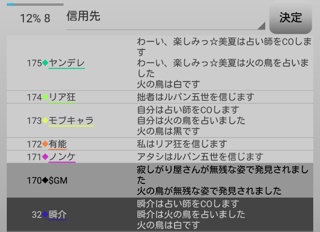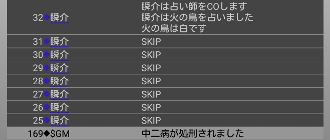 瞬介「明日、4日目の占いでは3人の占い師が最後に残ったグレー村人である火の鳥を占う。まさか火の鳥が妖狐で呪殺が起きたりしないよね。3日目にグレー吊りを提唱した火の鳥が妖狐なはずはないよね」