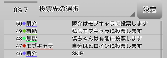 結果は有能の推理どおりモブキャラが人狼であったわけですが、実は投票結果でおかしなことが起きています。1回目の投票では皆が宣言した通りの投票先になっていると思います。