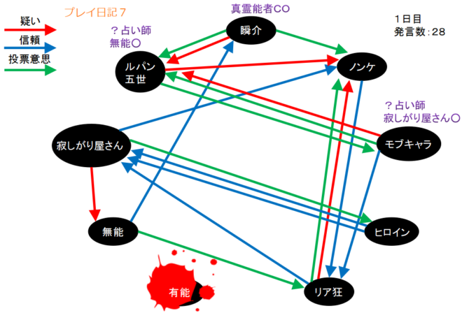 そして今回は1日目に●が出たことから不確定な村人である自分が吊られることはないだろうと、2日目朝に噛まれないよう無茶苦茶な行動をしまくったわけですが、失敗だったと思います(笑)。例えば1日目の投票前の状況は下図のようになるわけですけど。