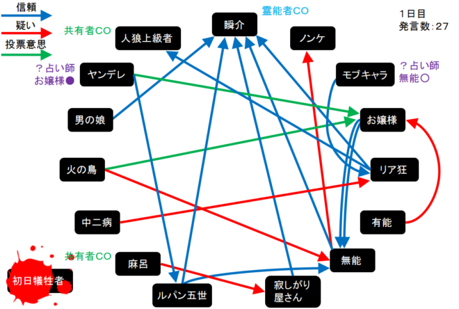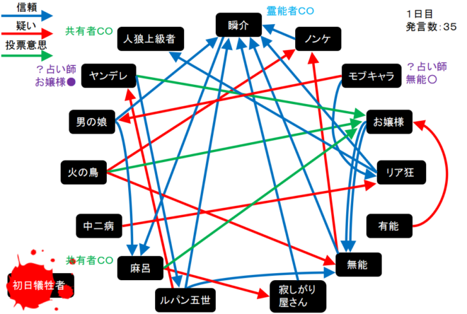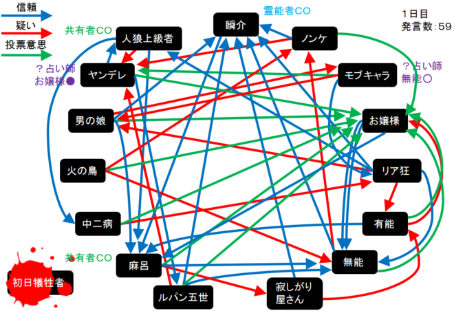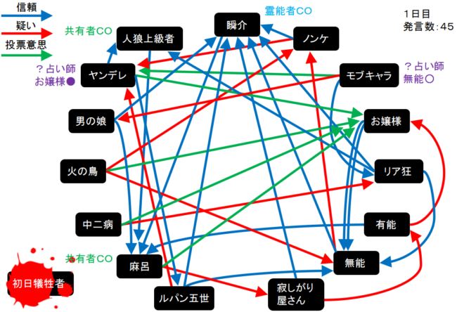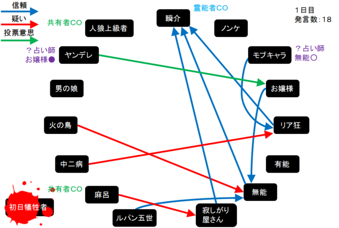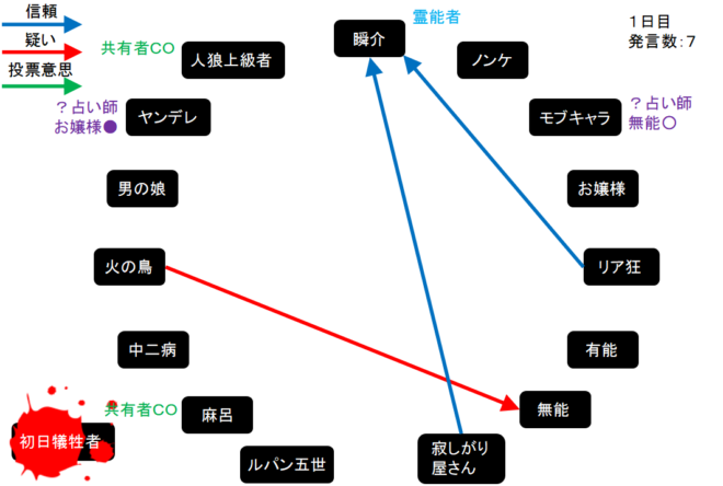 今回の初日犠牲者は初日犠牲者さんです。1日目呪殺、2日目真●を引いても勝てないなんて絶望してしまうんだよなあ。