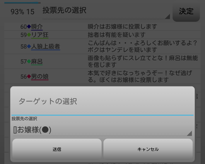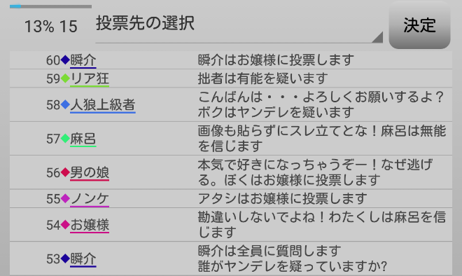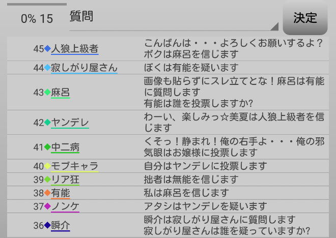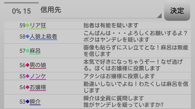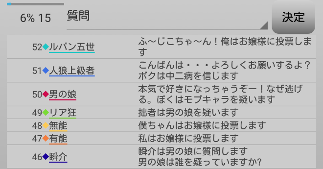 無能は誰も疑っていない。だが無能に質問をしても無駄なのでやめよう。お嬢様に疑い先を聞いても自身に●を出したヤンデレだと答えるだけだろう。ならば信頼している者を聞くか?どうせ共有者と答えるに違いない。占い師を疑っているプレイヤーがいないか聞こう。『誰かヤンデレを疑っている人はいませんか?』」