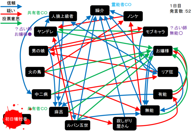 瞬介「モブキャラとヤンデレが占い師CO。占い結果は無能○とお嬢様●か。配役は真-狂かな?今日は●吊りの流れになってほしい(霊ロラはやめてほしい)」