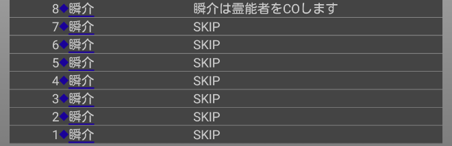 瞬介「さっそく霊能者COをしようか。狩人が俺を守ってくれたら勝てるんだけどなあ。『霊能者COをします!』俺は真霊能者です!」
