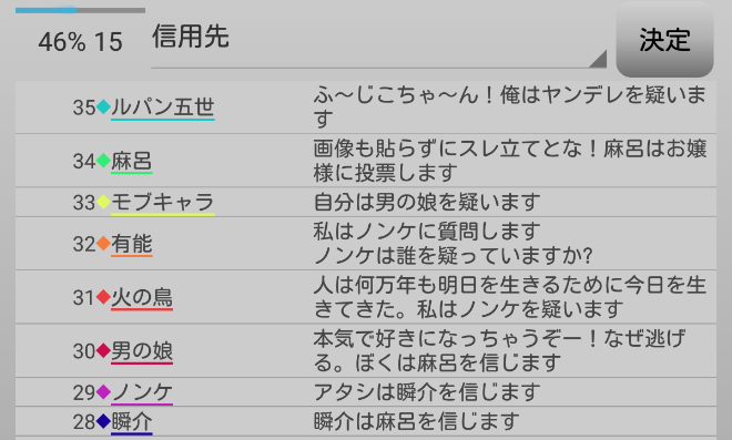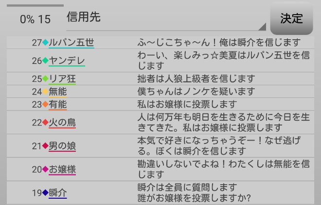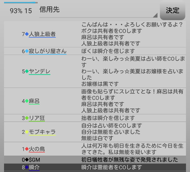 瞬介「真占い師はどちらか考えようか。モブキャラのリア狂信頼と男の娘疑いは謎だ。ヤンデレはルパン信頼が意味不明なのである。どっちも偽者っぽいな(笑)。どちらかと言えばヤンデレが真っぽいかな?」