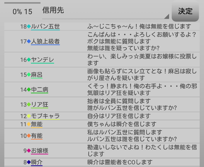 霊ロラ進行の時はゴミクズ以下の扱いを受ける霊能者。しかし?真霊能者の時は信頼度がトップクラス!共有者並の発言力を持つのだ。前回のゲームと比べたら天国と地獄みたいな格差を感じるよ。