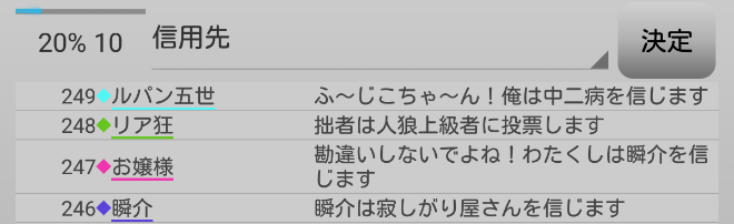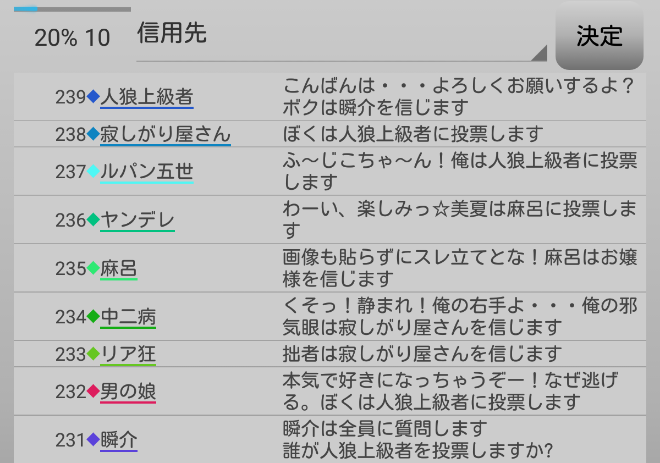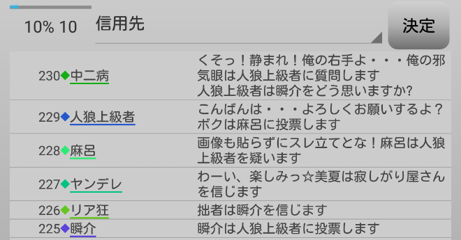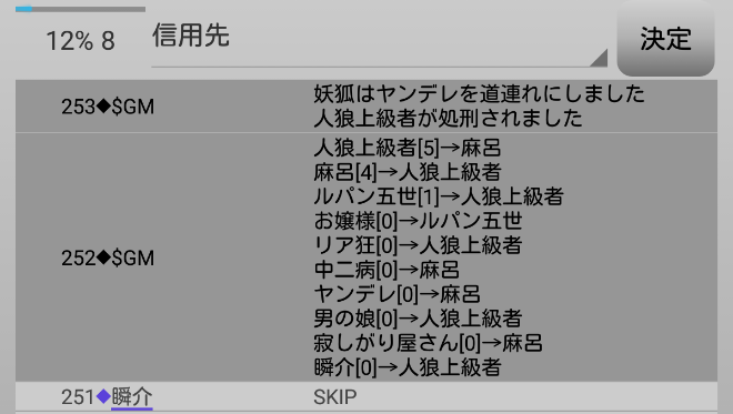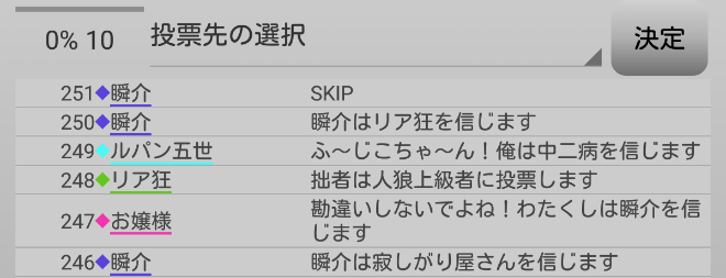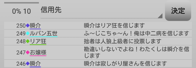 瞬介「リア狂が人狼上級者投票に動いてくれたので信頼をしておこう。俺は『リア狂を信頼しています!』」